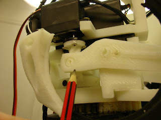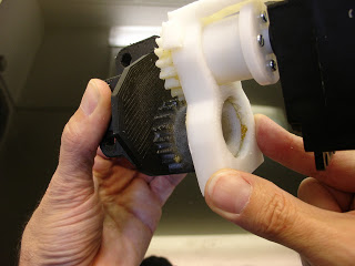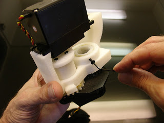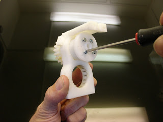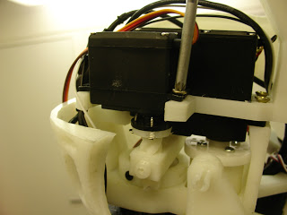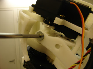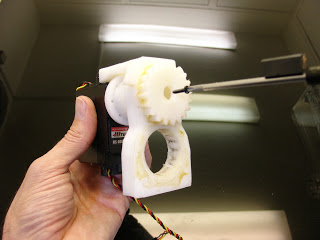 Befestigen Sie diese Baugruppe an der Baugruppe „MainGear“ und „NeckHinge“ und verwenden Sie etwas Fett, um die Drehung zu erleichtern. „GearHolder“ sollte mit „NeckHinge“ ausgerichtet sein und Ihr Servo sollte sich immer noch auf 90° befinden.